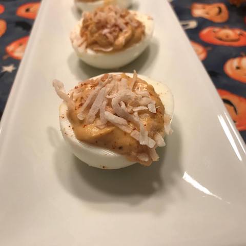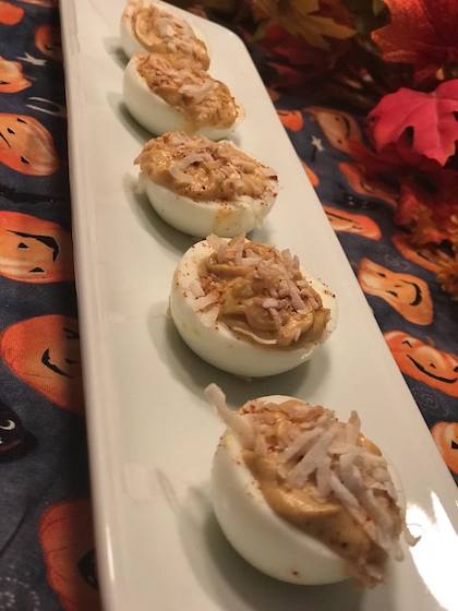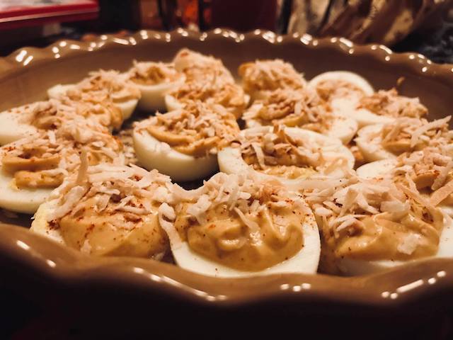 - Sprinkle the eggs with coconut flakes and serve at room temperature